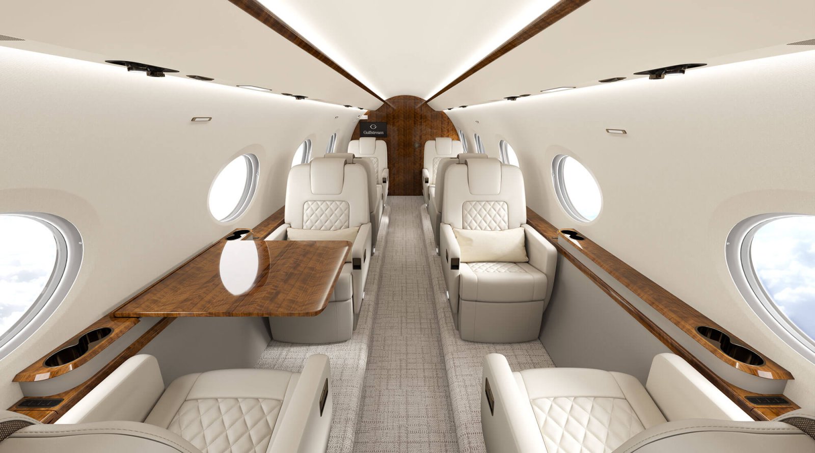 The Gulfstream G300 cabin is designed to provide a comfortable and productive environment for passengers during private flights.